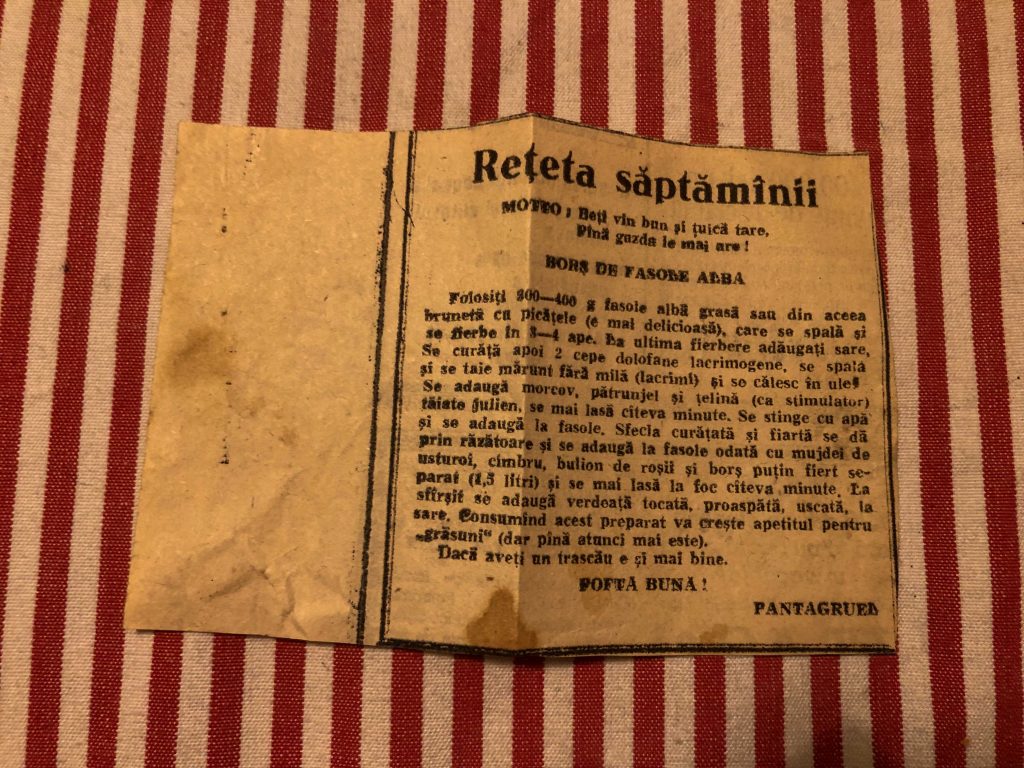 Folosiți 300-400 g fasole alba grasă sau din aceea brunetă cu picățele (e mai delicioasă), care se spală și se fierbe în 3-4 ape. La ultima fierbere adăugați sare. Se curăță apoi 2 cepe dolofane lacrimogene, se spală şi se taie mărunt fără milă (lacrimi) şi se călesc în ulei. Se adaugă morcov, pătrunjel şi ţelină (ca stimulator) tăiate julien, se mai lasă câteva minute. Se stinge cu apă şi se adaugă la fasole. Sfecla curățată și fiartă se dă prin răzătoare şi se adaugă la fasole odată cu mujdei de usturoi, cimbru, bulion de roşii şi borş puțin fiert separat (1,5 litri) şi se mai lasă la foc câteva minute. La sfârșit se adaugă verdeață tocată, proaspătă, uscată, la sare, Consumând acest preparat va crește apetitul pentru grăsuni” (dar până atunci mai este).