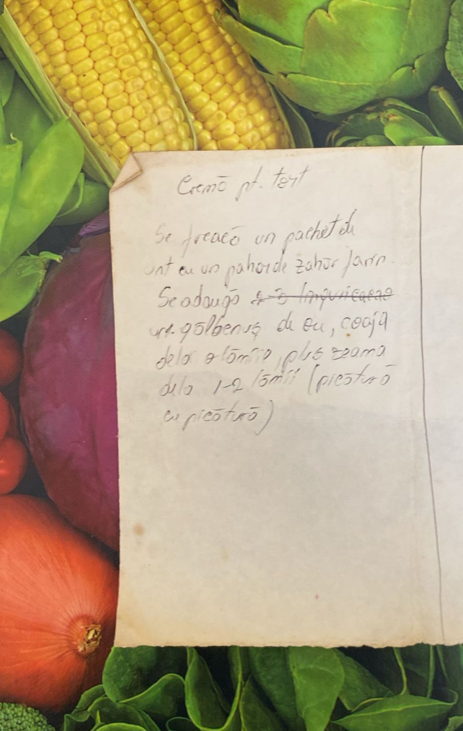 Descoperă Caietul de RețeteCrema: 6 ouă 300g zahăr 300g nuci 2 lingurițe rom sau vanilie F...(ilizibil) spumă galbenușurile...