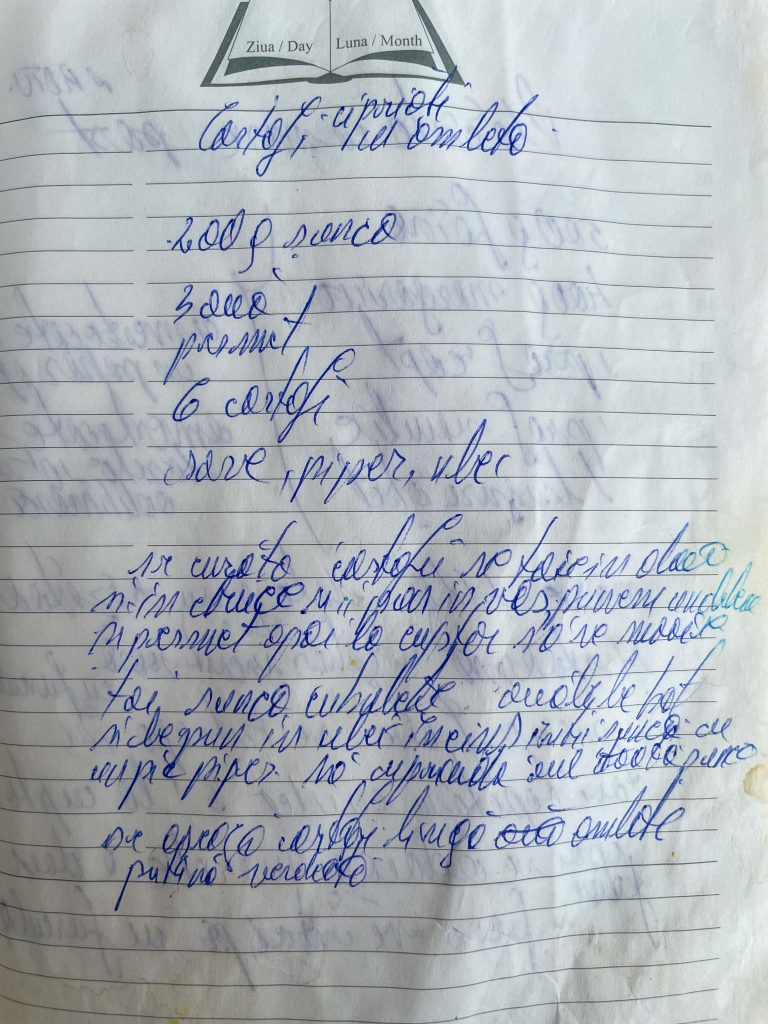 Tai șunca cubulețe, ouăle le bat și le pun în ulei încins, întâi șunca cu un pic piper. [ilizibil]