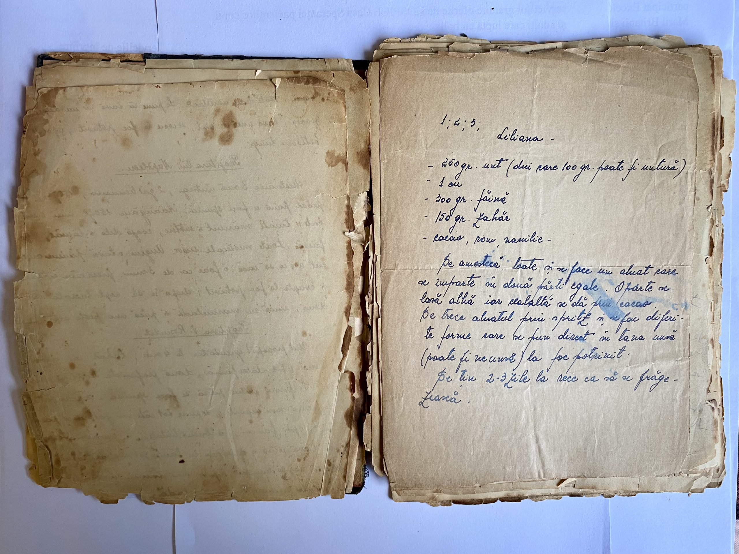 Acest caiet ne-a fost pus la dispoziție de Irina-Margareta Nistor. Este o operă colectivă, începută înainte de anii ’30, în care au notat străbunica Irinei, Aneta Alessiu, bunica ei, Veturia Petrescu și sora acesteia, Elvira Hebberling. Bunica era cea care gătea cel mai des în familie, ne-a spus Irina. A făcut-o până la aproape 90 de ani. Era chimistă și avea rigoarea gramajului.