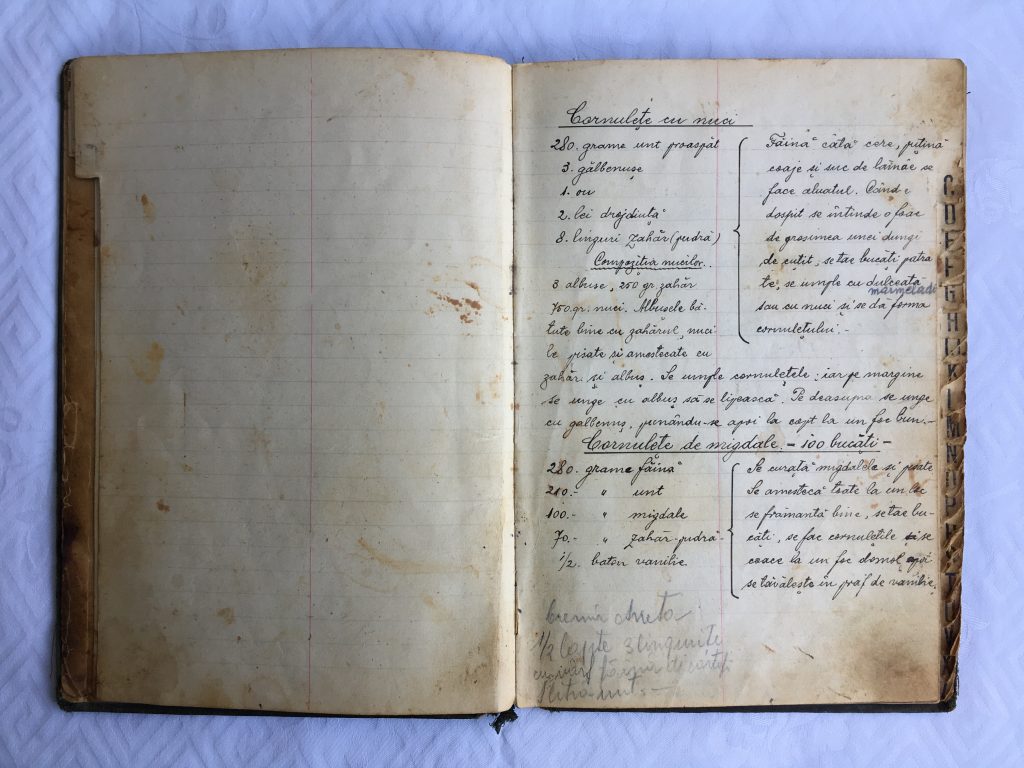 Făină câtă cere, puțină coajă și suc de lămâie. Se face aluatul. Când e dospit, se întinde o foaie de grosimea unei dungi de cuțit, se taie bucăți pătrate, se umple cu dulceață/ marmeladă sau cu nuci și se dă forma cornulețului.