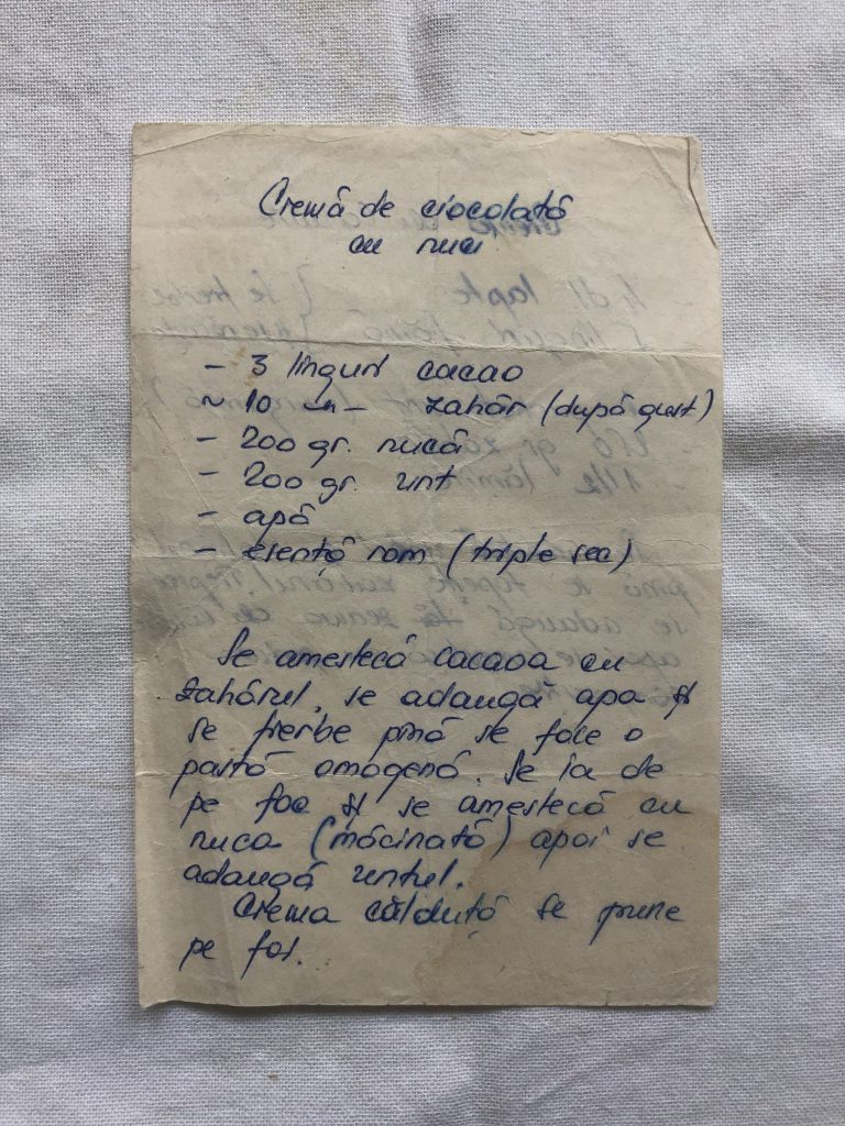 Se amestecă cacao cu zahărul, se adaugă apă și se fierbe până se face o pastă omogenă. Se ia de pe foc și se amestecă cu nucă măcinată, apoi se adaugă untul. Crema călduță se pune pe foi.