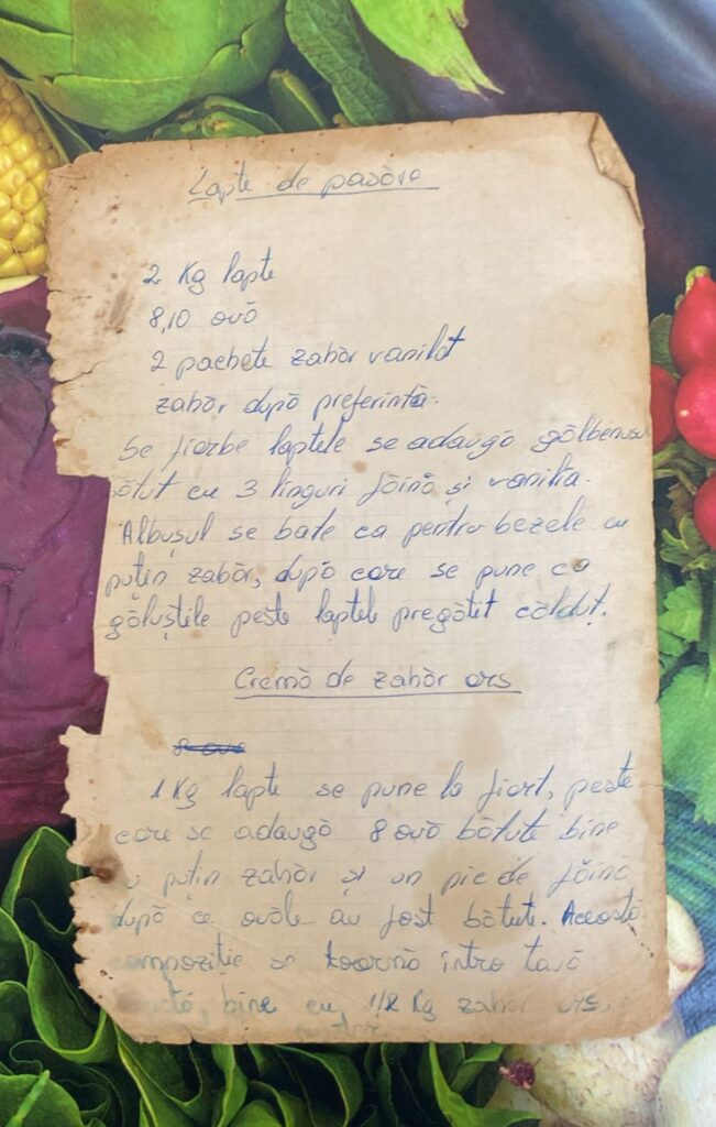 1Kg lapte se pune la fiert, peste care se adaugă 8 ouă bătute bine puțin zahăr și un pic de făină după ce ouăle au fost bătute. Această compoziție se toarnă întro tavă =ilizibil bine cu 1/2 Kg zahăr ars, =ilizibil
