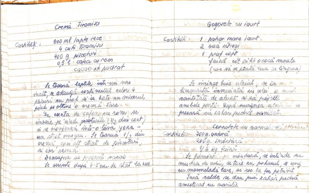 Se toarnă laptele într-un vas înalt, se adaugă conținutul celor 3 plicuri cu praf și se bate cu mixerul până se obține o cremă tare. În esența de cafea cu rom se înmoaie pe rând pișcoturile (1/2 din cant.) și se aranjează într-o tavă yena – un strat omogen. Se toarnă 1/2 din cremă, apoi alt strat de pișcoturi și iar cremă.