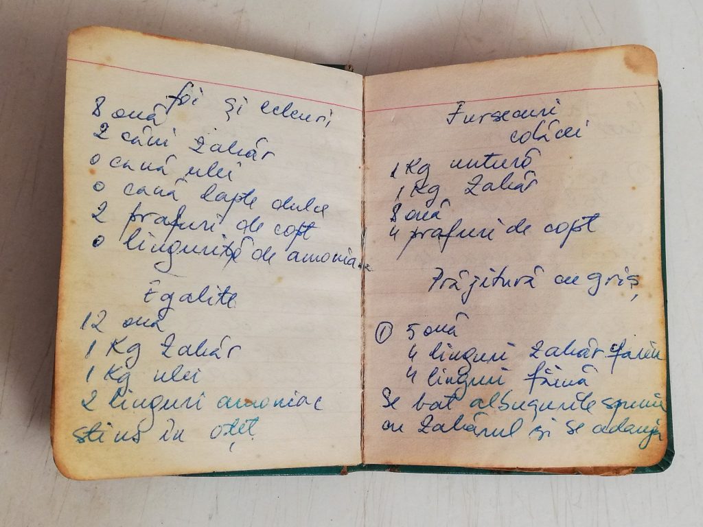 Caiet de rețete Nicoleta Șerban (I)EGALITE 13 noiembrie 2022 12 ouă1 kg zahăr1 kg ulei1 linguri amoniac stins în oțet ← Anterior FOI ȘI ECLEURI Următorul → FURSECURI COLĂCEI