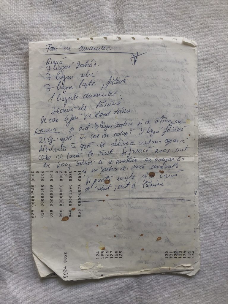 Cremă: se ard 3 lingurițe zahăr și se sting cu 250 g apă în care se adaugă 3 linguri făină dizolvată în apă. Se obține o ciulama groasă care se lasă la răcit. Se freacă 200 g unt cu 200 g zahăr și se amestecă cu compoziția și un pahar de nucă măcinată. Se poate umple și cu cremă de rahat, unt și lămâie.