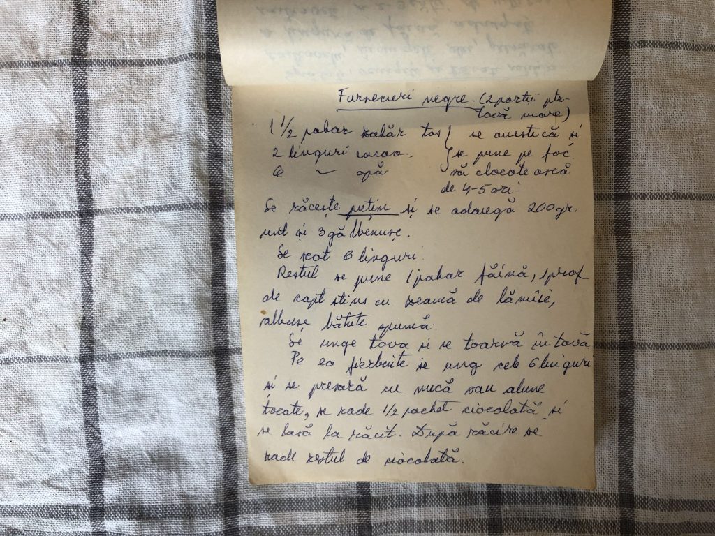 Se răcește puțin și se adaugă 200 g unt și 3 gălbenușuri. Se scot 6 linguri. Restul se pune 1 pahar zahăr, 1 praf de copt stins cu zeamă de lămâie, albușuri bătute spumă. Se unge tava și se toarnă în tavă. Pe ea fierbinte se ung cele 6 linguri și se presară cu nucă sau alune tocate, se rade 1/2 pachet ciocolată și se lasă la răcit. După răcire se rade restul de ciocolată.