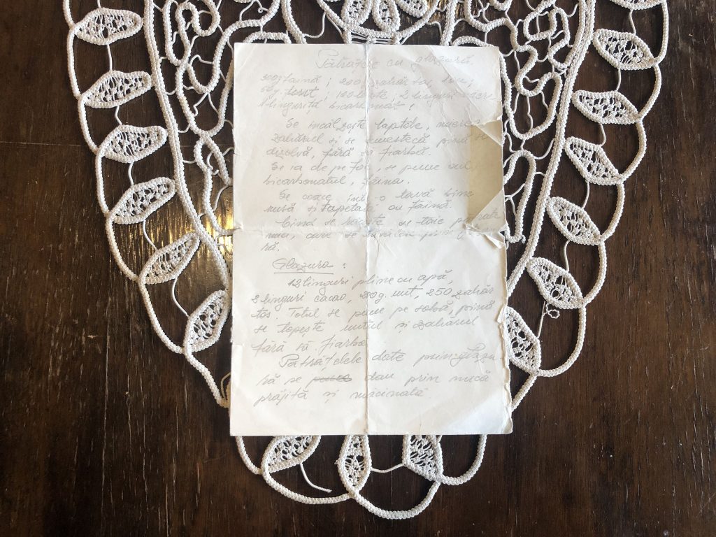 12 linguri pline cu apă, 2 linguri cacao, 200 g unt, 250 zahăr tos. Totul se pune pe soba, până se topește untul și zahărul fără să fiarbă.