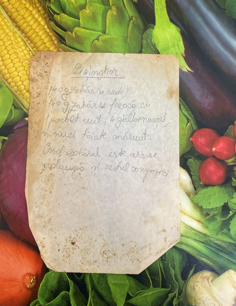 140g zahăr se freacă cu 1 pachet unt , 4 gălbenușuri si nuci tăiate mărunt.