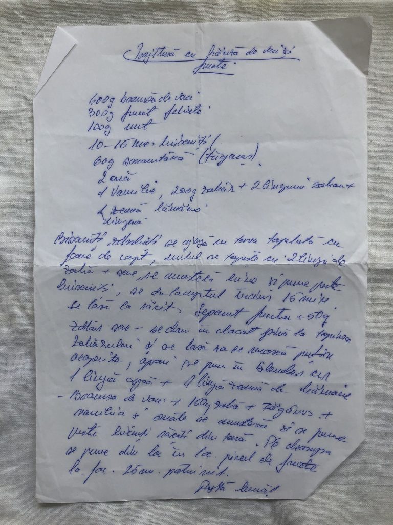 Separat fructe + 50 g zahăr, sare – se dau în clocot până la topirea zahărului și se lasă să se răcească puțin acoperită, apoi se pun în blender cu o lingură apă +o lingură zeamă de lămâie + brânza de vaci + 150 g zahăr + smântână + vanilia și ouăle se amestecă și se pune peste biscuiții răciți din tavă. Pe deasupra se pune din loc în loc piureul de fructe.