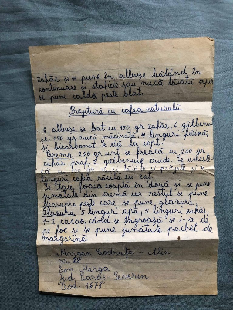 6 albușuri se bat cu 150 g de zahăr, sa se gălbenușe, 150 g de nucă măcinată, 4 linguri de făină și bicarbonat. Se dă la copt.