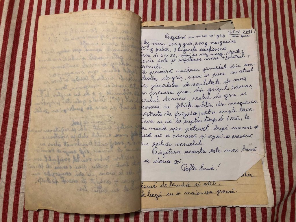 Se presoară uniform jumătate din cantitatea de griș, apoi se pune un strat din jumătate de cantitate de mere. Se presară jum din grișul rămas, restul de mere, restul de griș, se acoperă cu feliuțe subțiri din margarina păstrată (la frigider) cât se umple tava. Tava se dă la cuptor timp de 1 oră, la foc moale spre potrivit. După coacere se lasă să se răcească și apoi se presară cu zahăr vanilat.
