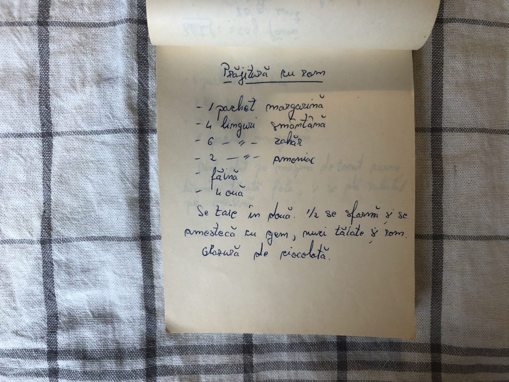 Caiet de rețete Ruxandra Covaci (I) - BrașovPRĂJITURĂ CU ROM 30 noiembrie 2022 1 pachet margarină4 linguri smântână6 linguri zahăr2 linguri amoniacfăină4 ouăSe taie în două, 1/2 se sfărâmă și se amestecă cu gem, nuci tăiate și rom. Glazură de ciocolată. ← Anterior PARFAIT Următorul → FURSECURI NEGRE