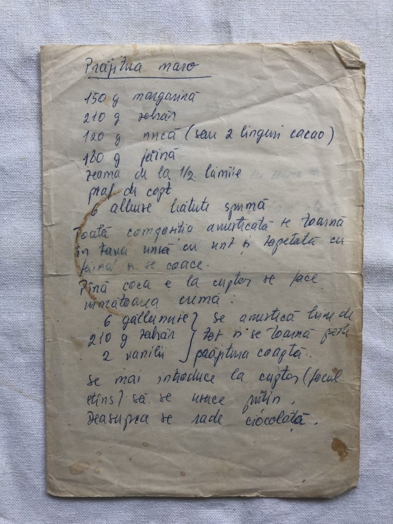 Toate se amestecă bine de tot și se toarnă peste prăjitura coaptă. Se mai introduce la cuptor (focul stins) să se usuce puțin. Deasupra se rade ciocolată.